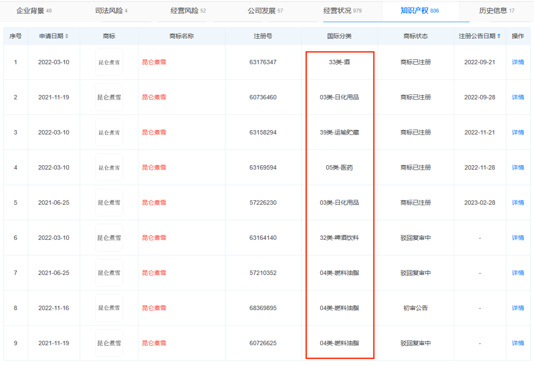 天眼查还显示,北京广宜科技有限公司还注册了多个类别的“昆仑煮雪”商标,包括第33类(酒)、第39类(运输贮藏)、第5类(医药)等,另外在第32类(啤酒饮料)、第4类(燃料油脂)两类商标的申请则处于驳回复审状态。
