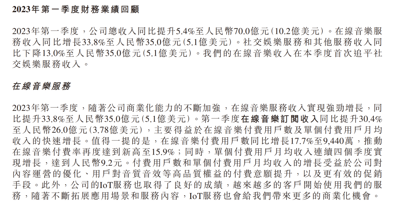 2023年第一季度,腾讯音乐的财报喜忧参半。