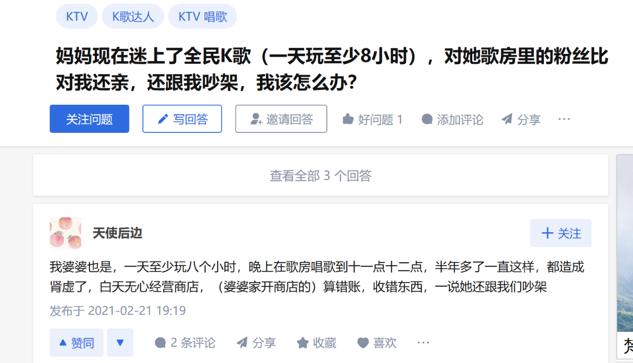 知乎有不少问题,大意都是“如何让妈妈戒掉全民K歌”“老公/老爸沉迷全民K歌对家人态度恶劣怎么办”……