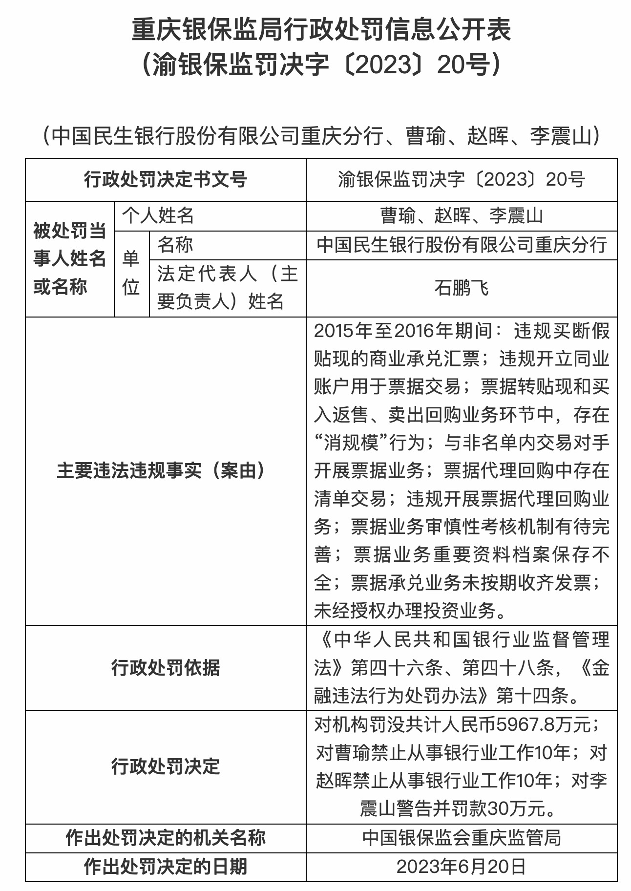 6月21日,国家金融监督管理总局网站披露罚单,对中国民生银行股份有限公司重庆分行罚没共计人民币5967.8万元;对曹瑜禁止从事银行业工作10年;对赵晖禁止从事银行业工作10年;对李震山警告并罚款30万元。主要违法违规事实为,2015年至2016年期间:违规买断假贴现的商业承兑汇票;违规开立同业账户用于票据交易;票据转贴现和买入返售、卖出回购业务环节中,存在“消规模”行为;与非名单内交易对手开展票据业务;票据代理回购中存在清单交易;违规开展票据代理回购业务;票据业务审慎性考核机制有待完善;票据业务重要资料档案保存不全;票据承兑业务未按期收齐发票;未经授权办理投资业务。