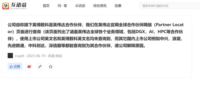 在“互动易”平台,有投资者就英博数科与英伟达合作相关事项询问了鸿博股份:“公司自称旗下英博数科是英伟达合作伙伴,我们在英伟达官网全球合作伙伴网络(Partner Locator)页面进行查询(该页面列出了涵盖英伟达全球各个业务领域,包括DGX,AI,HPC等合作伙伴),使用上市公司英文名和英博数科英文名均未查询到,而其它国内上市公司例如中兴,浪潮,先进数通,中科创达,深信服等都能查询到为其合作伙伴,请公司解释原因。”截至发稿,鸿博股份尚未回复该投资者的提问。