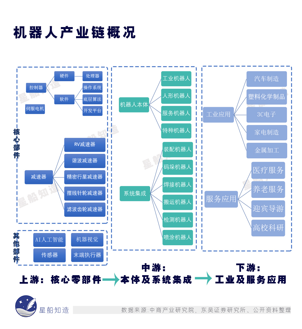 人形机器人,作为机器人领域里新崛起的一个重要分支,其产业链也是由上中下游三个部分组成。