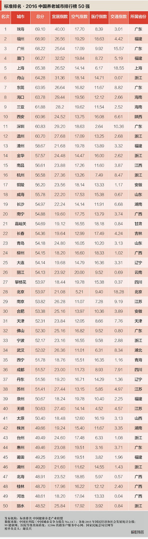 2016中国养老城市排行榜的评判标准正基于此。其基础样本来自中国社科院今年发布的《中国城市竞争力报告No.14》中最宜居的前100个城市,然后以宜居指数(40%权重)、空气指数(20%权重)、医疗指数(20%权重)、交通指数(20%权重)四方面作为最终评价标准。