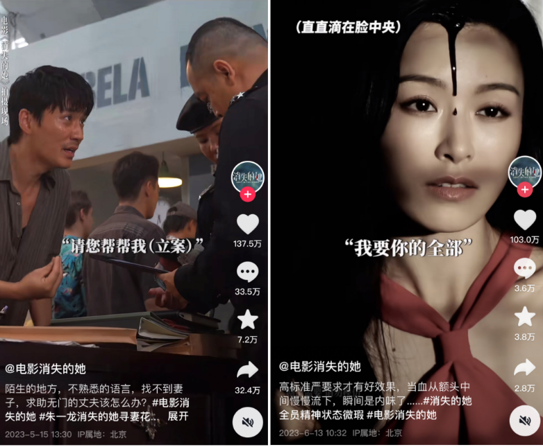 在《消失的她》官方抖音中,点赞数超百万的两个视频分别是主演朱一龙和袁咏珊的表演花絮片段,视频文案中也带上演技以及拍摄细节的相关话题词。