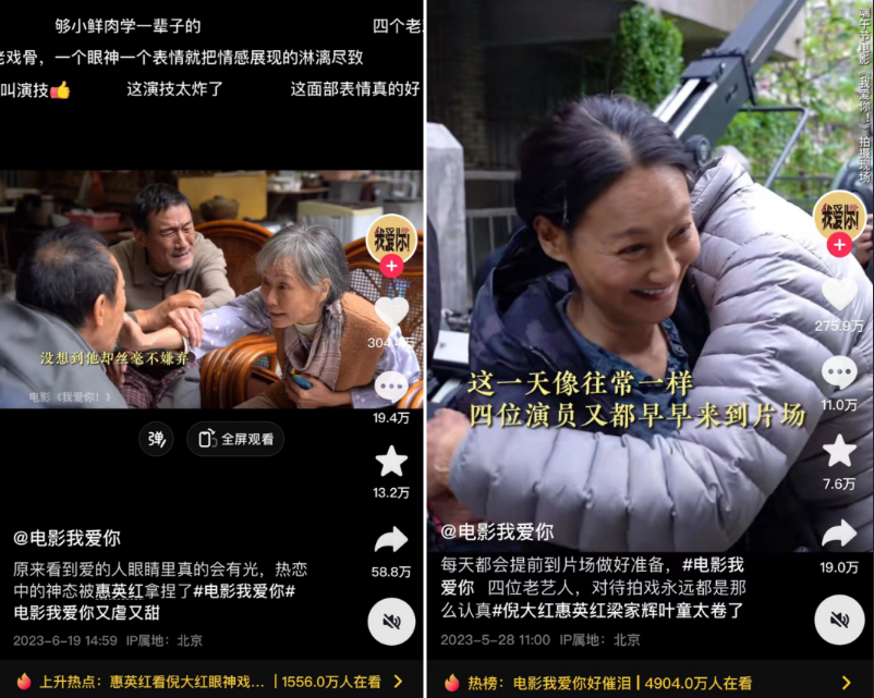 这是《我爱你!》的特殊性:老年人爱情的题材,对优秀演员年华老去的惋惜,天生就具有催泪因素。演员们脸上的皱纹、深情的眼神、老态的动作,都通过视频化表达获得不错的传播与讨论热度。