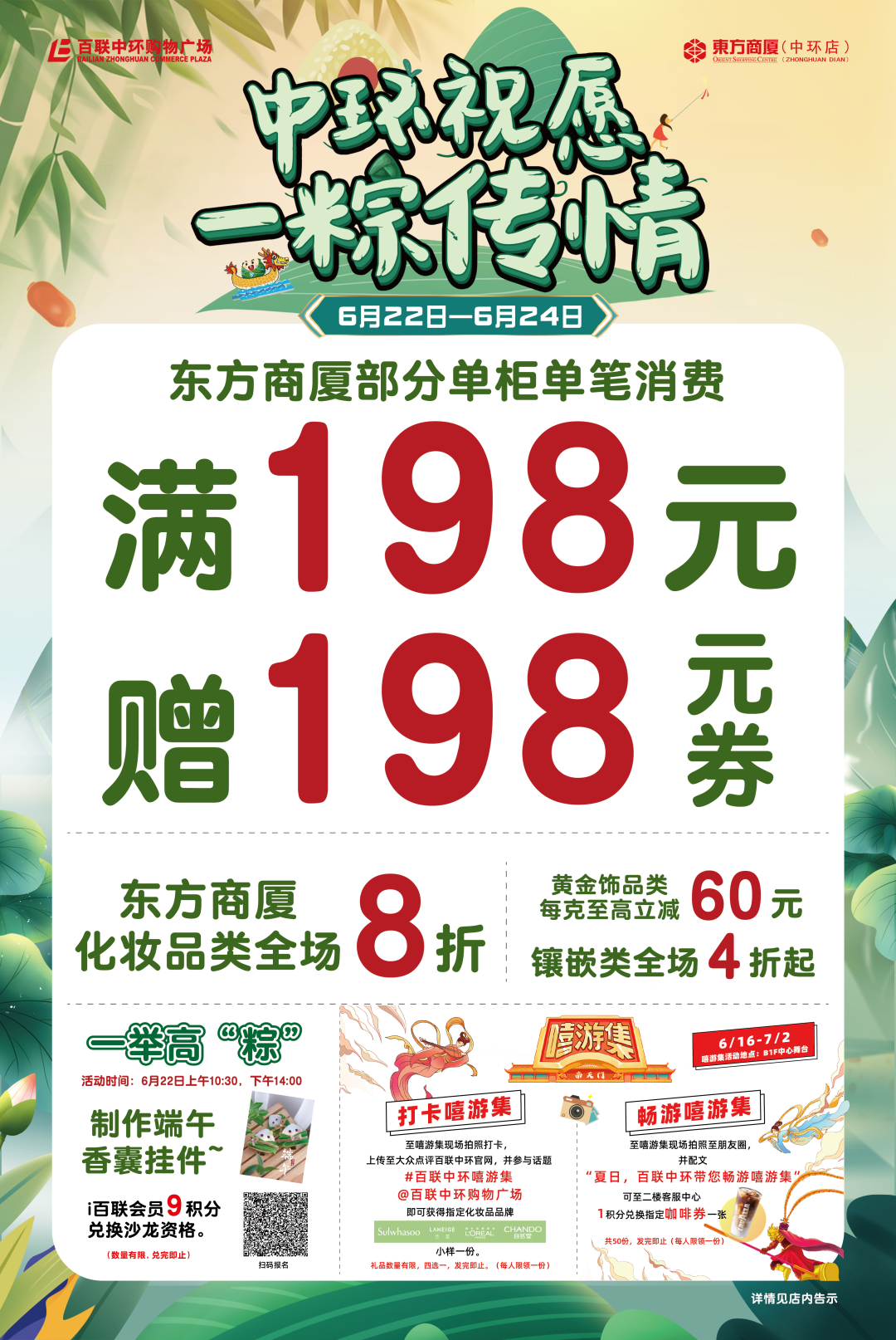 在百联中环购物广场,实惠购、亲子DIY、游戏互动、打卡领好礼等一系列超值惊喜纷至沓来。端午节期间,东方商厦单柜单笔消费满198赠198券、化妆品全场8折、黄金饰品每克优惠30-60元、镶嵌类全场4折起。此外,商场将举办端午亲子DIY手作活动,凭9积分即可兑换活动资格,手工制作端午香囊挂件。在B1中心舞台,“嘻游集”亲子主题小集市将有游戏互动、打卡送好礼等活动。