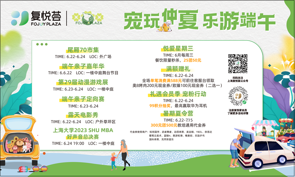 一场趣味盎然、琳琅满目的尾厢奇遇,国风主题的二次元活动,可夏日纳凉的露天电影秀……在复悦荟,除了精彩纷呈的端午活动,商场还重点推出端午亲子嘉年华——集合8家知名教育培训机构,让周围社区小朋友能在暑期即将到来之际,有更多充实自我的选择。除了丰富的舞台互动和表演可以参加和欣赏,小朋友还可与父母一同到教育培训商户店里打卡体验,完成定向打卡任务,可获得复悦荟提供的端午大礼包。