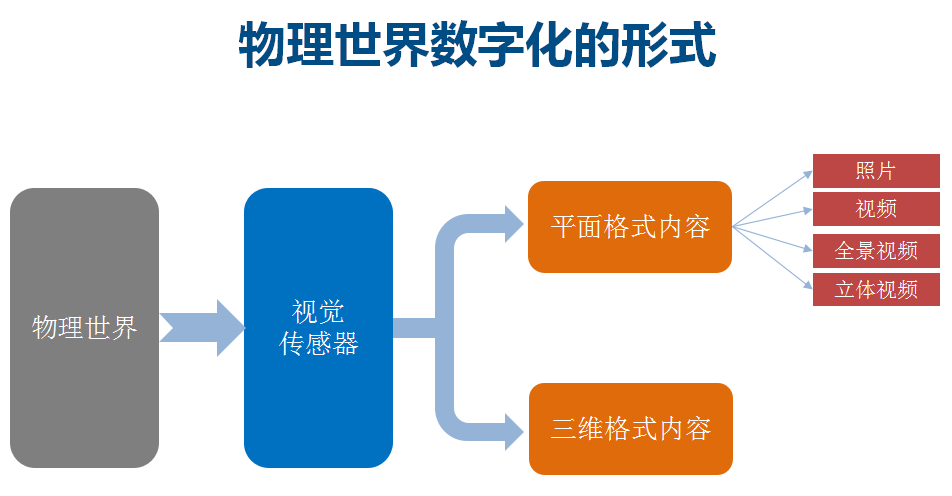 现在我们来关注一下,从物理世界怎么样通过传感器和设备来产生内容。第一种是比较常见的:平面格式内容,就比如用相机、DV来拍照片、视频等等。