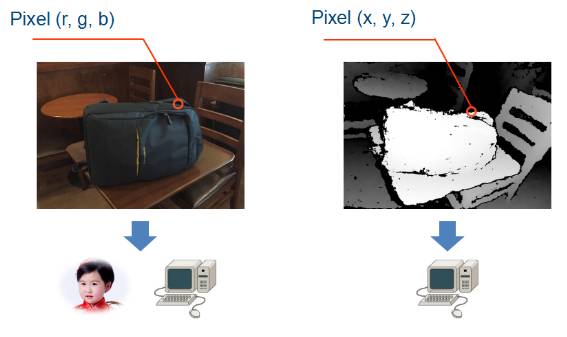 人的眼睛看外面的世界,通过视觉渠道,是能够同时获得RGB和XYZ信息的。比如大家在看我时,能够看到衣服、头发等颜色信息,也有对我的身高、体型、我们之间的距离等空间几何感。当然人的视觉系统有个缺陷,对空间几何信息的量化比较差,比如你可以看出我们之间的距离是三米左右,但没办法看出是3.1米还是3.45米这样精确的信息。
