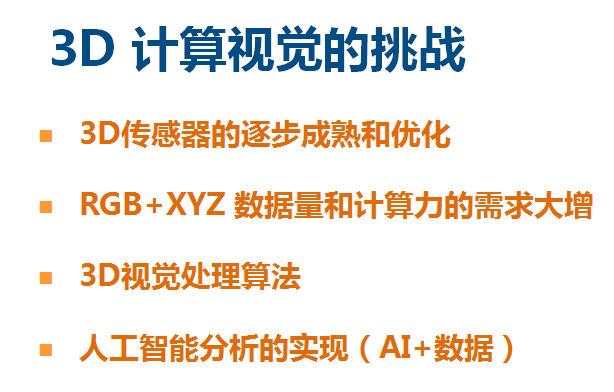 第二,把RGB和XYZ数据采集回来后,怎么去承载和实现三维视觉算法的处理器,对处理器的要求非常大,目前的都不够用。
