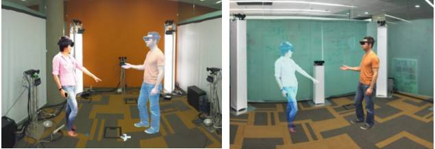 当我和一个朋友一起带上微软的HoloPortation系统,在我的视野里面就会出现远程那个人的画面,那个人真实站在我面前,我可以围着他转,做动作等等。这其实就是把远程那个人的实时三维模型建立出来了,每一个时刻的三维模型,每一帧都是完整、准确的,然后通过AR/VR设备显示出来。