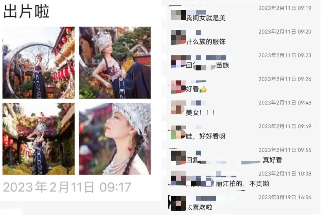 图/林淼在丽江的旅拍成片和部分朋友圈评论,来源/林淼提供