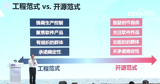 中国科学院院士王怀民认为,在确定性的创新和面对明确用户时,更适合自上而下的工程范式,可以满足软件开发的时间和成本控制需求;而不确定的创新,需要自下而上的开源范式,通过群智涌现来创作源代码。
