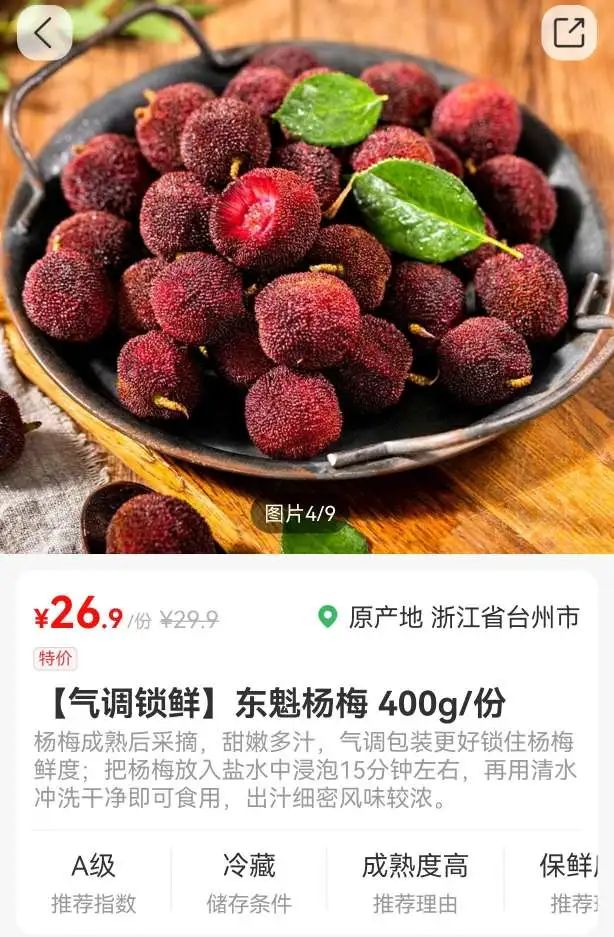 “现在对于杨梅的形容经常出现‘乒乓球大小’等字眼,实际上杨梅的个头大小不是评判杨梅好坏的最关键指标,最重要的是要具有杨梅的风味和口感,要以甜为主以酸为辅。”叮咚买菜的水果开发人员表示,东魁杨梅上线后平台销量可观,目前每份售价29.9元(约400g),价格相比去年有所下降,日均销量超10000多份,预计今年销售额将超500万元。此外,杨梅的尝鲜季较短,仅有一个月左右,预计将于7月15日左右下架。