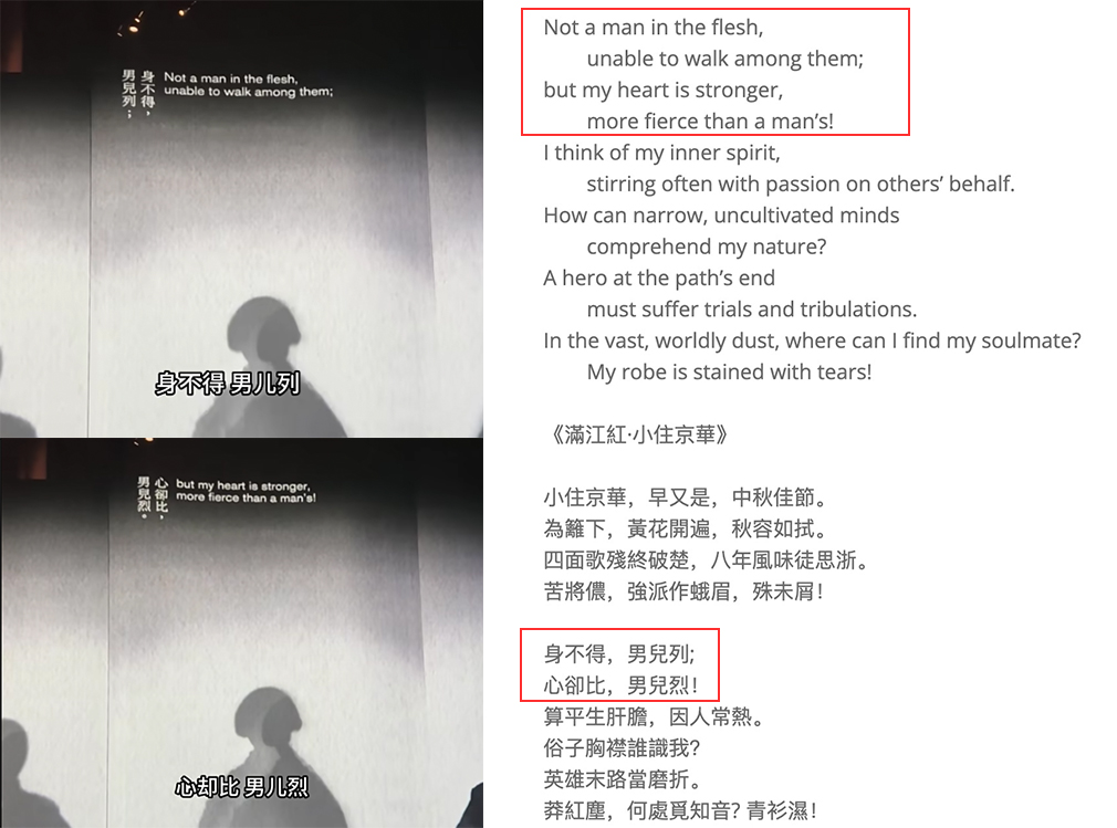 很快,这条消息被大量译者同行转发,转发量超过1.5万,Yilin随后在评论区晒出了大英博物馆抄袭其译文的对比图。Yilin指出,展览中展示的多处秋瑾诗作译文与她此前发布在个人网站上的一模一样,除此之外,导览手册上以及配合此次展览出版的图书上也都有她的译文。