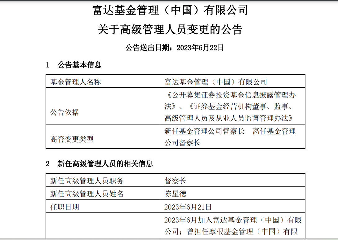 6月22日,富达基金发布公告称,原督察长方芳因个人原因离职,陈星德接任督察长一职,任职日期为6月21日。