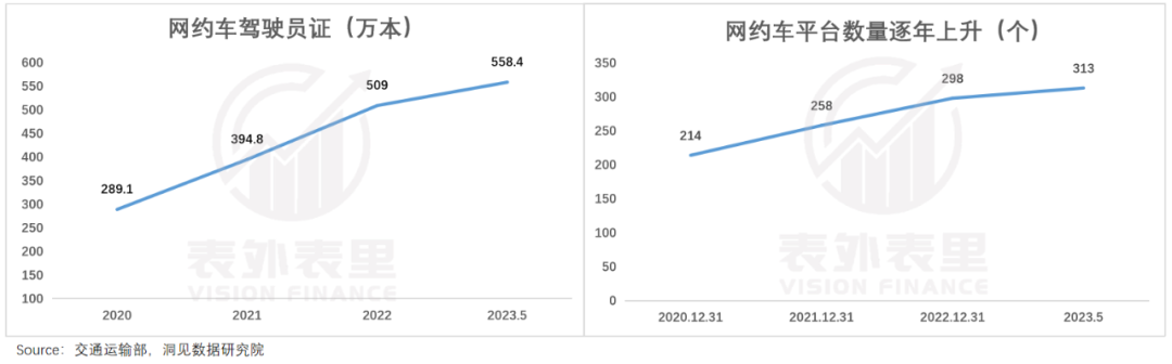 再加上大环境疲软,大量灵活就业人员涌入。如下图,截至今年5月底,各地共发放网约车驾驶证558.4万本,相较于2020年底接近翻倍。