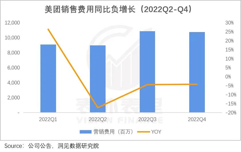 美团来说,降低了对外卖的补贴。可以看到,2022年美团连续三个季度销售费用同比负增长。