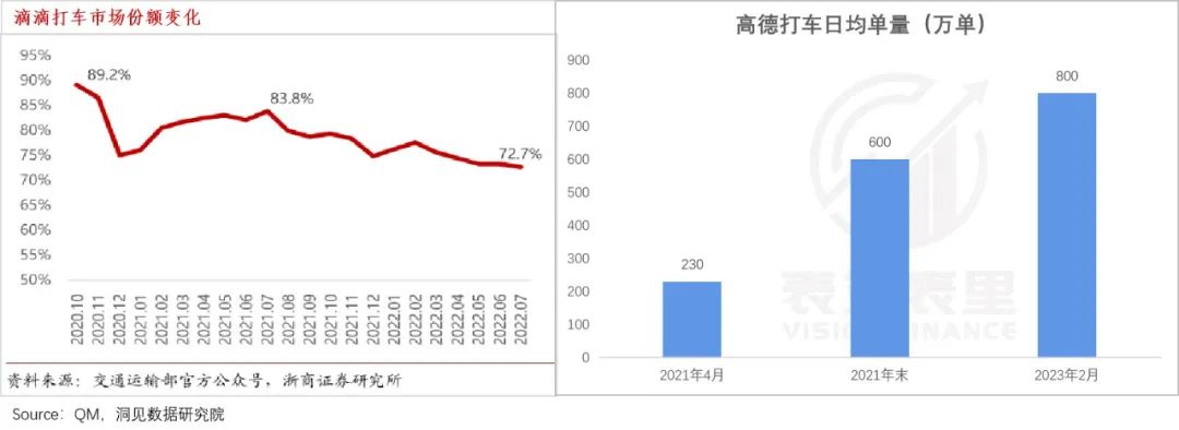 今年初高德打车市场份额提升到三成(滴滴从九成降到了七成);同时,截至2023年2月,日均单量一度能达到800万单。