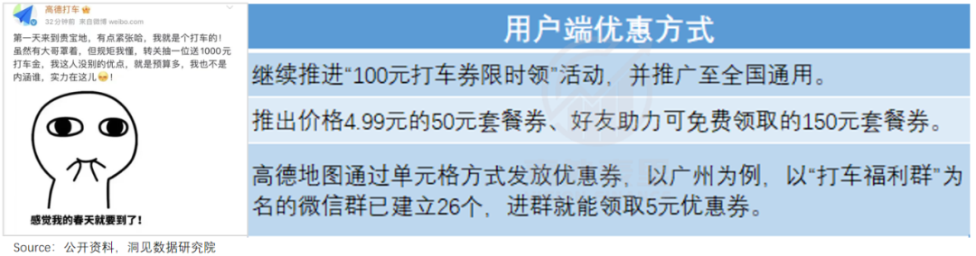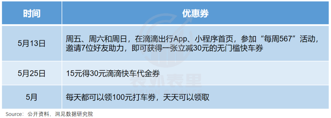 年初,滴滴重新上架,在用户端一直做发券活动,促进用户打车。统计显示仅仅5月,大额代金券活动就有三次。