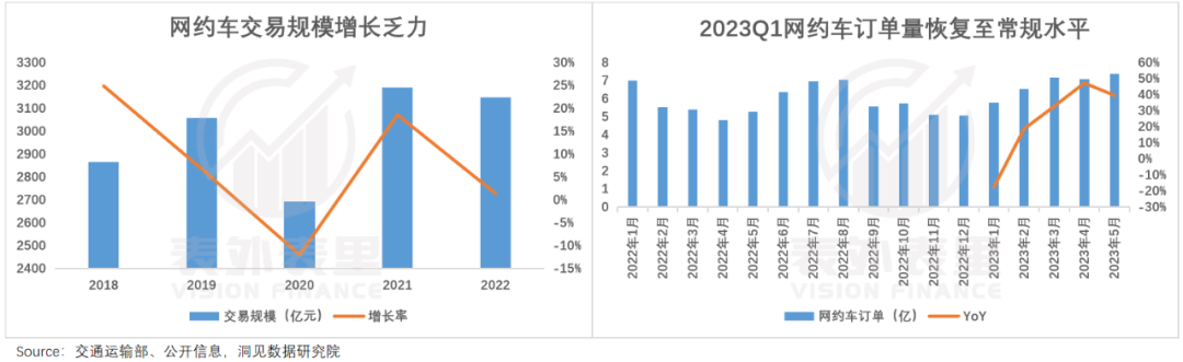可以看到,网约车自2019年开始增长乏力,2022年的市场规模甚至同比下降了1.38%。2023Q1网约车订单量虽大幅增长,但也只是逐渐恢复至常规水平。