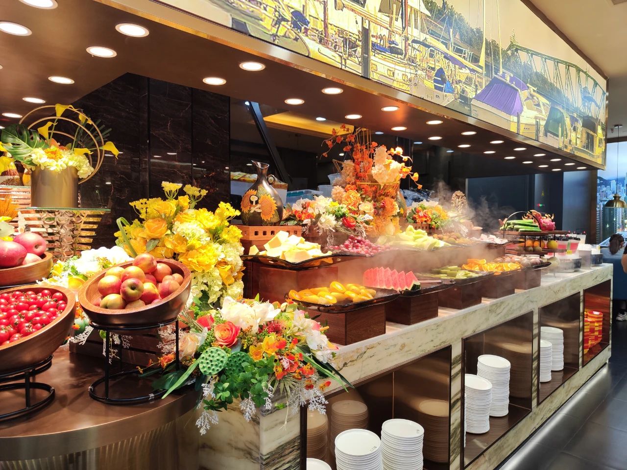 比如,水果饮品区域的餐盘周围摆有铜象、铜孔雀、舞姿铜人等东南亚风格的摆件;餐台上随处可见的用鲜花和热带绿植编织的花篮以及各种热带花卉、植物。
