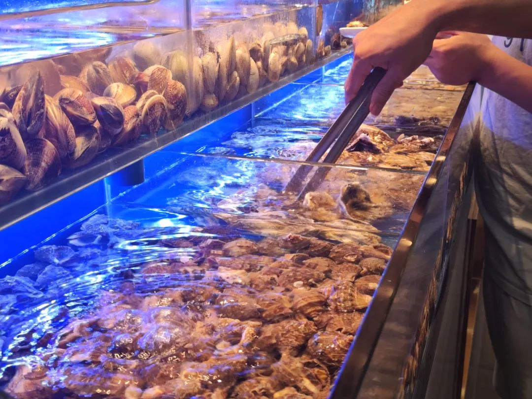 食材方面,有各种肉类、海鲜、蔬菜。其中,海鲜食材的种类颇为丰富,既有冷冻海鲜,也有鲜活海鲜,涵盖了各种虾、蟹、墨鱼、鲷鱼、黄花鱼、鲍鱼、生蚝、花螺等。