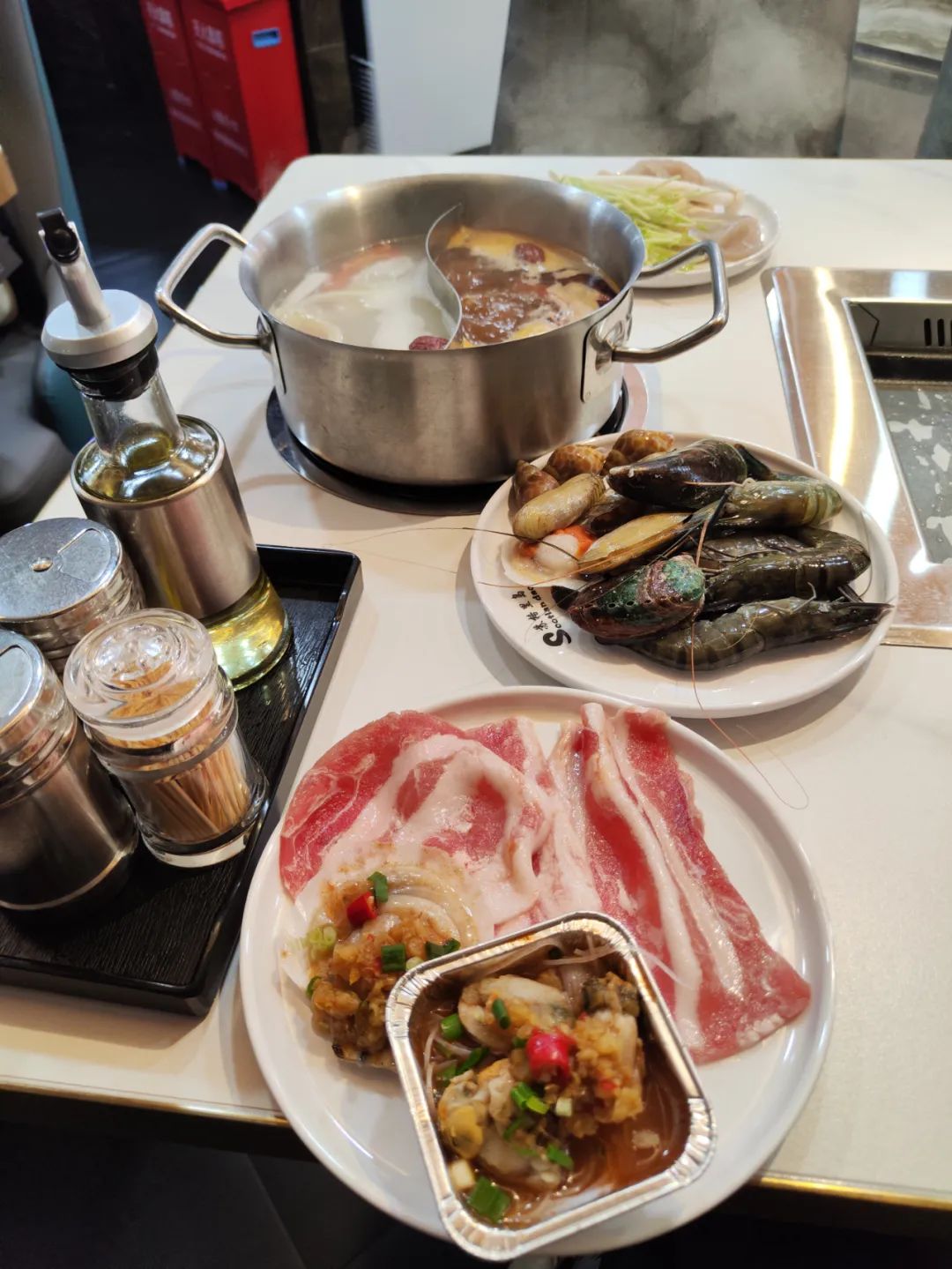 门店内的每一张餐桌上,都放有一口1-2人食分量的小火锅,中间为一块方形的烤肉盘。火锅锅底有鸳鸯、清汤、麻辣三种口味选择。