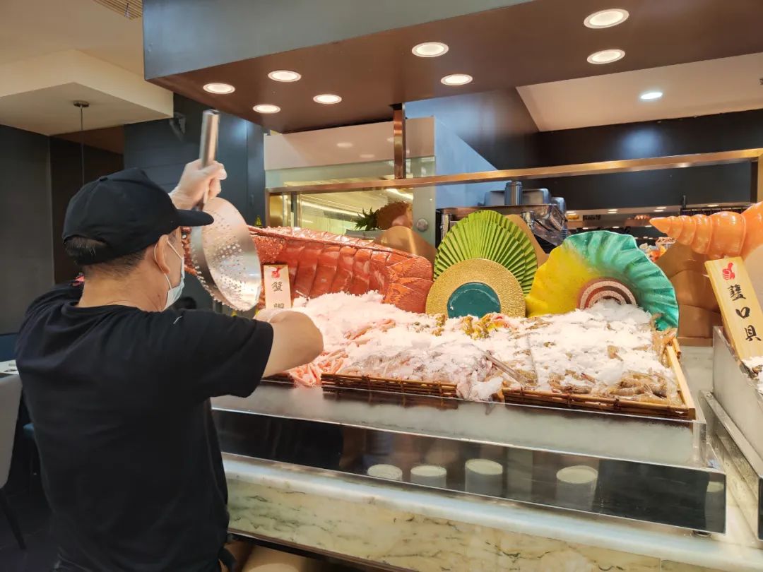 比如食材方面,红餐网在该店用完餐大概是下午3点左右,正值午市结束,晚市开始时。午市剩余的食材依然被放置在取餐台,虽然工作人员有用大量的冰对一些海鲜类食材进行冰鲜,但随着食材暴露在外时长的增加,可以想象,食材的新鲜度已经大打折扣。