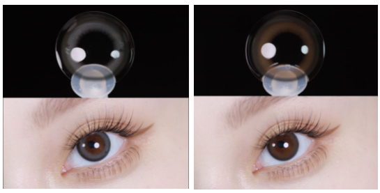 海俪恩萌宠熊猫系列主推果赖棕和胖达灰,这两款美瞳的镜片外包装,相同,都是以一只蹲坐在地上认真啃苹果的小熊猫装作。但是,镜片的花色却各有特点。果赖棕花色属于伪自然素颜款,外围有一圈黑色小锁边,配戴后让双眼自然放大,内圈是棕褐色的,并具有微弱的瞳色保护效果。整体配戴感觉使双眼更加水润无辜,适合素颜或纯欲风妆容。胖达灰的镜片外围同样有一圈黑色锁边,起到放大双眼的效果,内圈以黑灰色过渡,水光感十足,整体配戴效果给人一种以微混血、慵懒的少女感,加上镜片中若隐若现的熊猫掌印和竹子图案,别有一番萌趣。