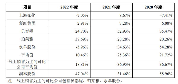 润本股份披露的招股书显示,2020至2022财年,公司主营业务(驱蚊产品、婴童护理产品系列、精油产品系列)呈现较快增长,收入分别达到4.43亿、5.82亿、8.56亿,年度增长率分别为58.96%、31.46%、47.04%。这一增长速度高于同行业可比公司的平均值,且增速高于其列出的竞争对手上海家化、彩虹集团、贝泰妮、珀莱雅以及水羊股份。