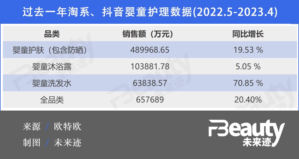 此外,欧特欧数据显示,在2022年5月至2023年4月,淘系、抖音两个主流线上渠道的婴童护理类目销售额同比过去一年增长了20.4%,远远高出市场大盘。其中按品类看,婴童面部护肤(包括防晒)增幅接近20%,婴童洗发水更是增长超过70%。