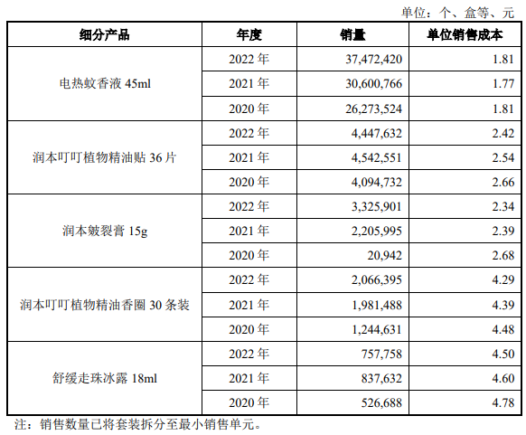 需要注意的是,润本在三个细分赛道上都各自跑出了“热销单品”。招股书显示,公司已经具有电热蚊香液、叮叮植物精油贴、皴裂膏等五款“大单品”,2020年至2022年的销售集中度分别为49.4%、43.95%和34.25%,2022年公司前五大单品的销售额对收入贡献程度较高。