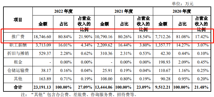 据最新招股书显示,润本股份近三年的研发投入占比逐年递减,2020年占比为2.42%,2022年的研发投入占比则减少至2.28%。与此相对的是,推广费用却在逐年上涨:从2020年的0.77亿元上涨到2022年的1.88亿,并且每年的推广费占总销售费用的比重均超过了80%。