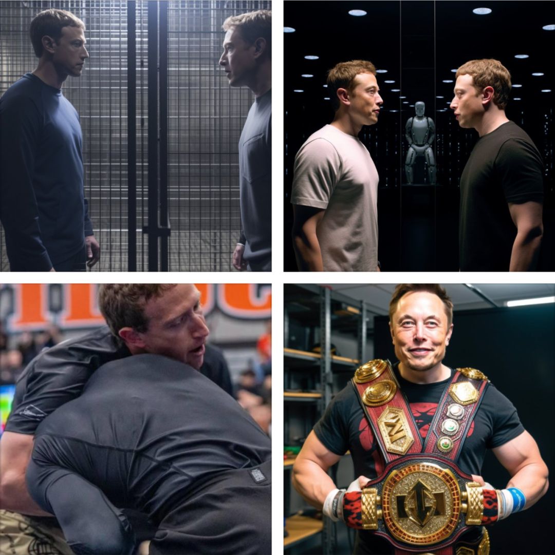 据量子位消息,推特博主@gaut画出了,马斯克和扎克伯格在比赛开始前的“对视阶段”;网友@Daniella Souza直接选用机器人作为裁判;网友@Engadget甚至预测出小扎将会给马斯克来一记“锁喉”;网友@Santa AI则认为,马斯克最终会赢得金腰带。