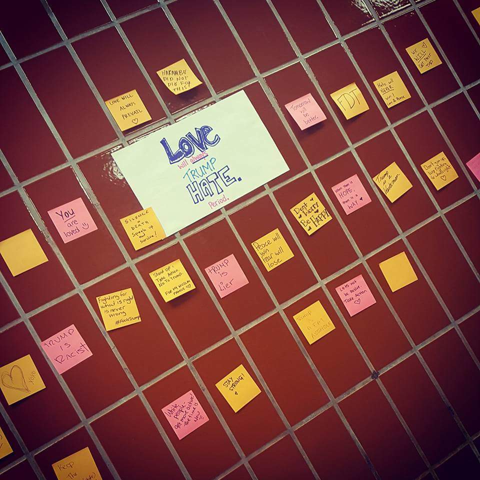 一开始,墙上留下的都是些绝望或气愤难过的字句。有人说“我们要完蛋了”,有人在为女权摇旗呐喊,而更多人选择将一肚子怒气变成咒骂特朗普的脏话。但渐渐,这些灰暗的想法都被互相鼓励的话覆盖了。
