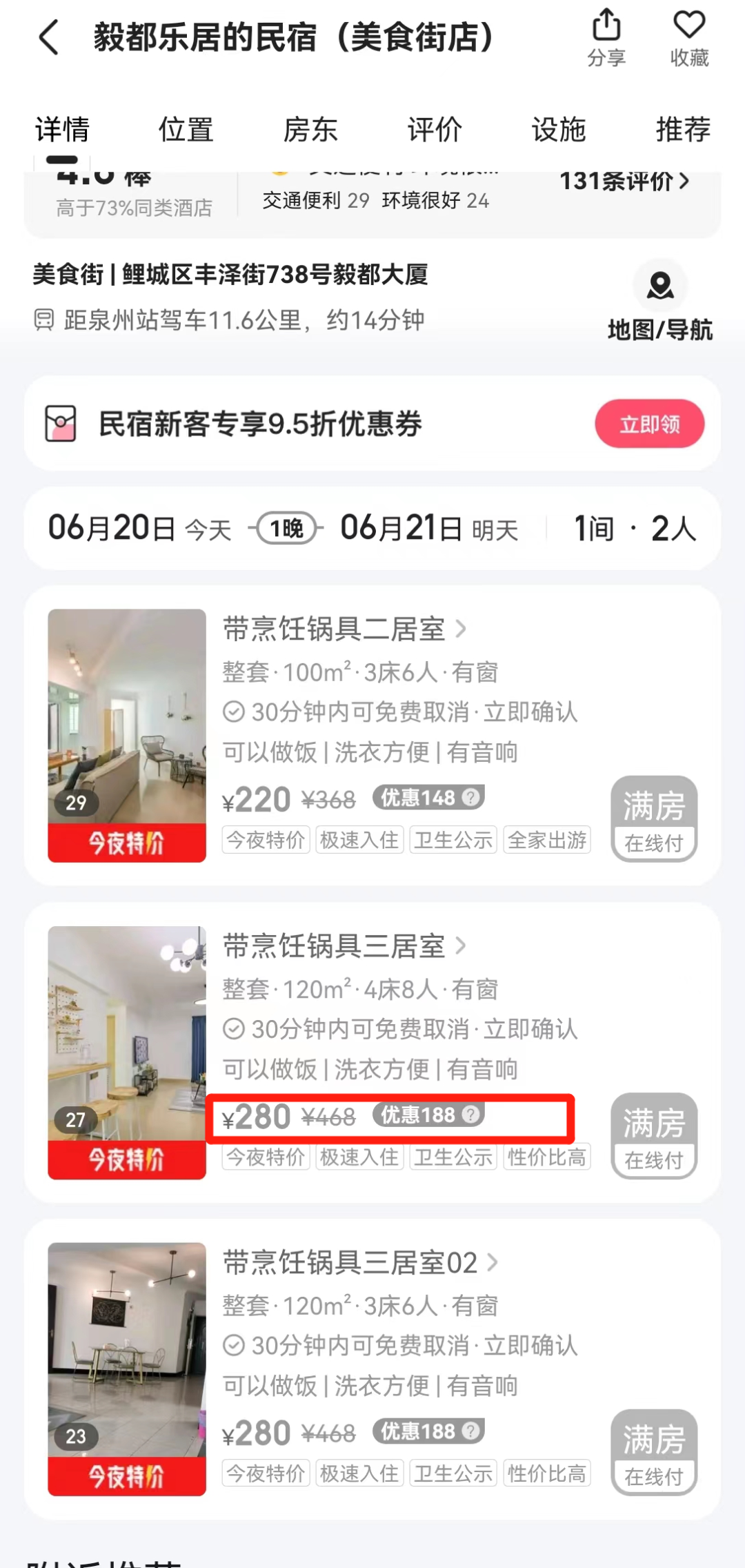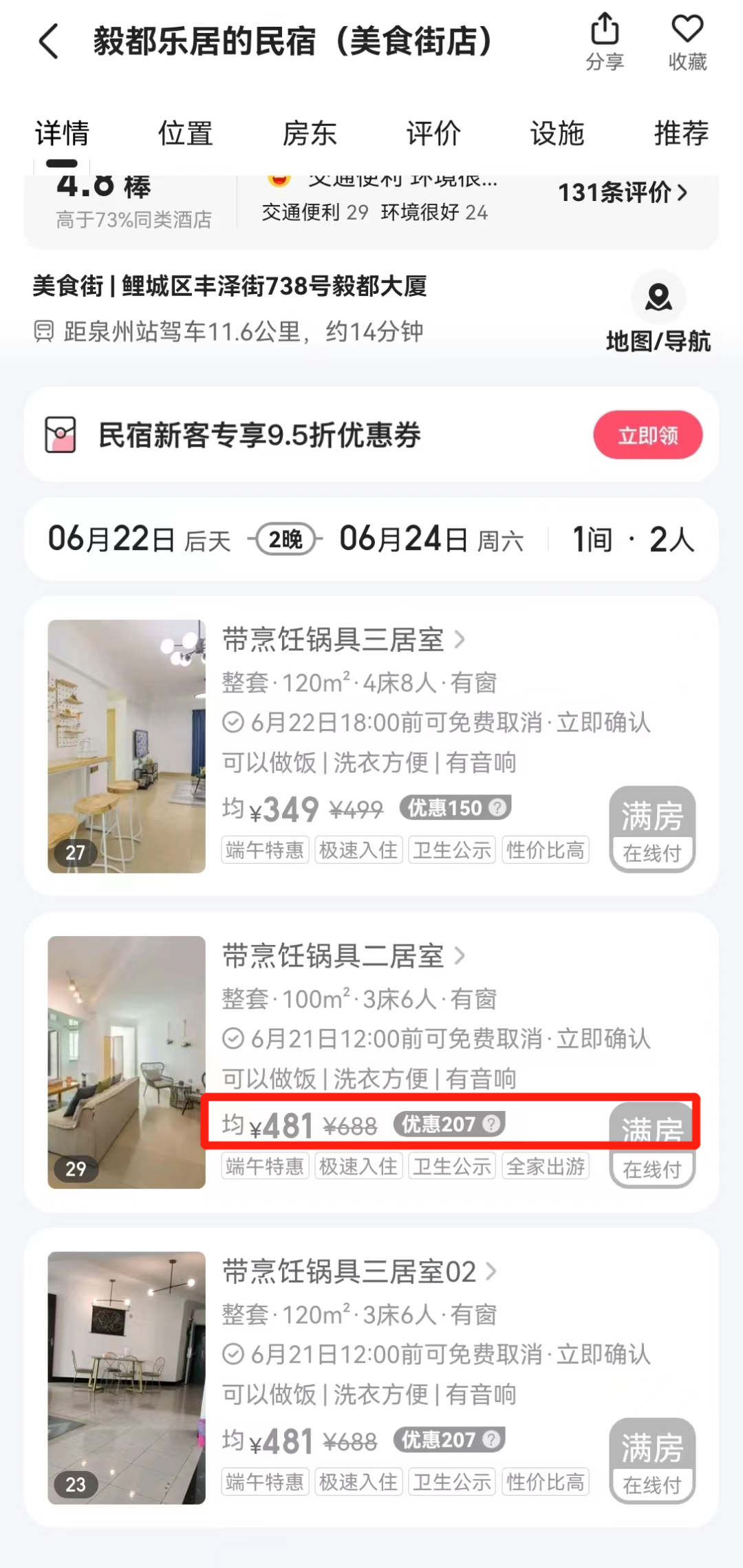 经营泉州西街旁民宿的强哥有三套房,自从爱彼迎退出中国市场,加上疫情的影响,他曾经休息了大半年。今年1月,强哥的毅都乐居在美团正式上线,为了能吸引更多游客,端午期间强哥不敢涨价太厉害,只是从280元上涨至481元。“端午假期本来就没有五一的长,要是再像五一那样涨价,谁还来住民宿。”