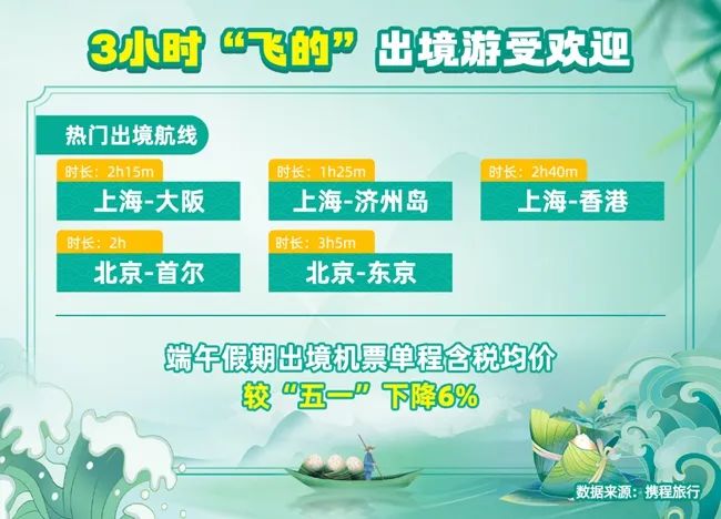 除了周边游,3小时左右的出境游也成为许多游客的选择,例如上海—大阪、上海—济州岛、北京—东京等,最短飞行时长在一个半小时以内,最长也仅约3小时。数据显示,端午假期出境游预订同比增长超12倍。