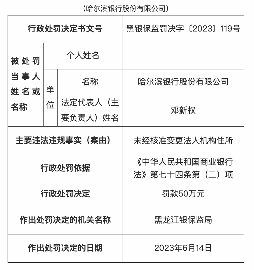 哈尔滨银行被罚50万元,因未经核准变更法人机构住所