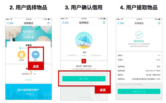 景区里提供了非常方便的信用借伞、借充电宝的服务。打开支付宝,只要芝麻信用分高于600分的用户都可以完成该体验,且不需要任何押金。