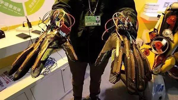 浙江盈米科技的智能手套给聋哑人士带来了福音。手套的手指上分布着传感器,手背装有芯片,聋哑人士手套做手语时,手套就可适时将动作代表的意思翻译出来,通过蓝牙发送到手机APP上,实现语音同步朗读。