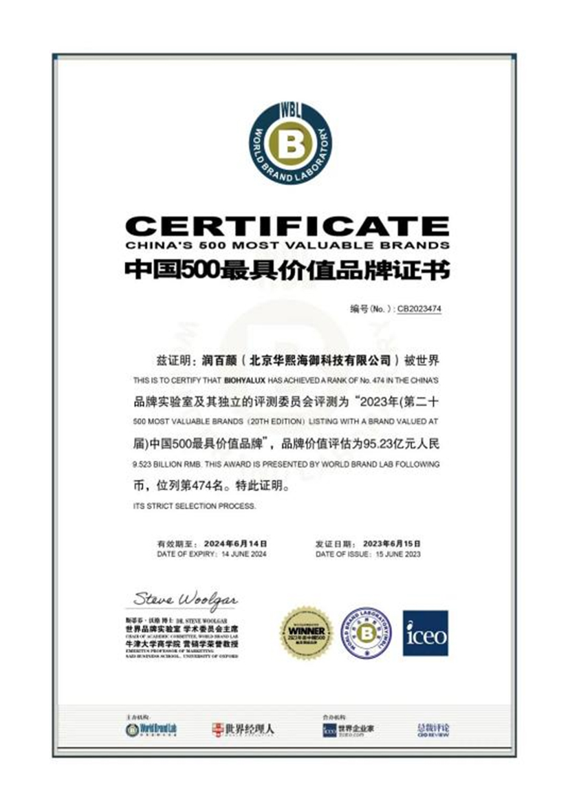 随着国家政策支持及Z世代新消费群体的崛起,中国品牌迎来良好的发展契机,迸发强大的增长势能。近期,由世界品牌实验室(World Brand Lab)主办的(第二十届)“世界品牌大会”在北京举行,会上发布了2023年“中国500最具价值品牌排行榜”。华熙生物及旗下核心战略品牌--润百颜再度登录该榜单,润百颜品牌价值接近百亿,达95.23亿元。