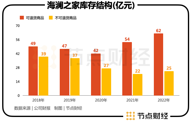 2022年,海澜之家的存货再次飙升至94.5亿元,库存周转率更是创下1.2次的年度新低。按照公司2022年年报中的分类,这其中的62亿存货属于“可退货”商品,24.5亿元库存需要自己处理。