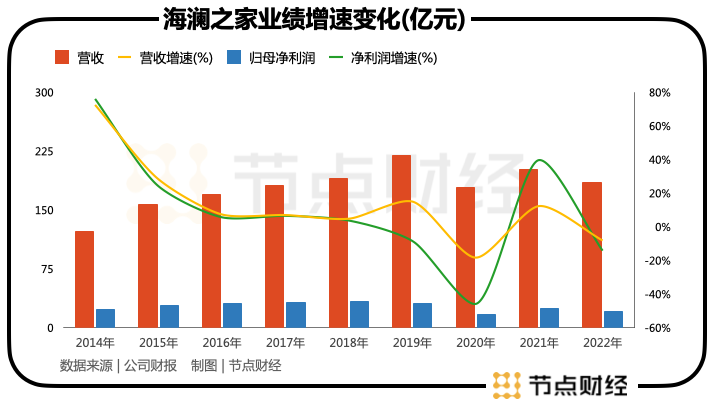 从趋势上看,自2016年开始,海澜之家的营收与净利润便进入了“个位数增长”时代,在最近的四个财年中,海澜之家更有三个财年处于净利润负增长之中。2022年,公司归母净利润尚不及2014年水平。