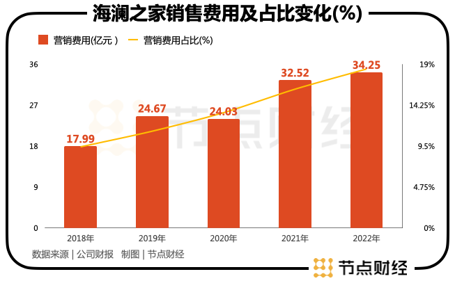 海澜之家财报显示,自2018年以来,公司的销售费用增长呈飙升趋势,由当18亿元增至34亿元,占营收的比例业也从不到9.5%增长至18.5%。