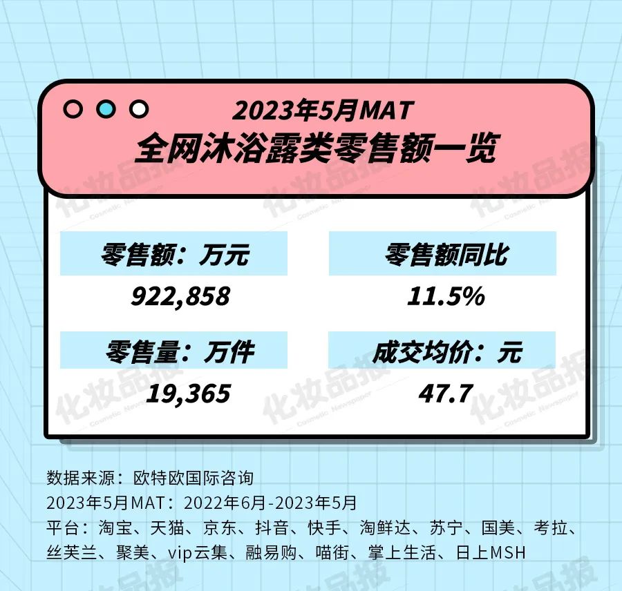 据欧特欧国际咨询公司统计,最近一年(2022年6月-2023年5月),全网沐浴露产品销售额为92.29亿元,同增11.5%,零售量达1.94亿件,成交均价为47.7元。