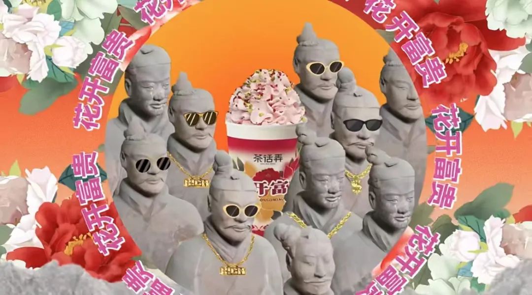 最近,茶话弄“花开富贵”、“以荷为贵”两款新品上新,以土味牡丹花图案设计的杯体,印着花开富贵四个大字,完美诠释了什么叫“土到极致就是潮”。