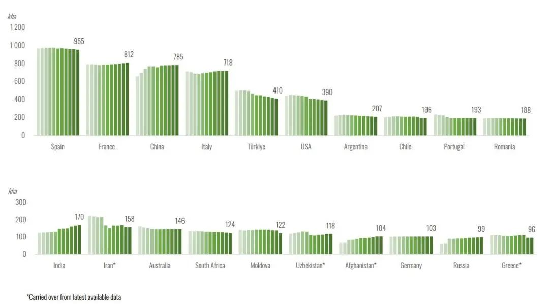 2012-2022年全球主要葡萄酒出口国葡萄园种植面积 图片来源:OIV