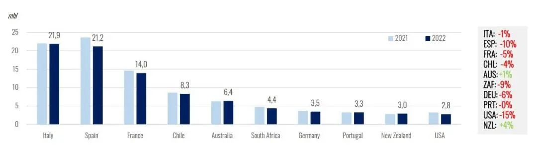 2022年全球主要葡萄酒出口国出口量 图片来源:OIV