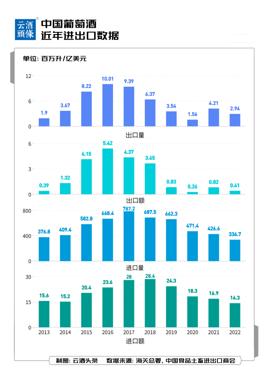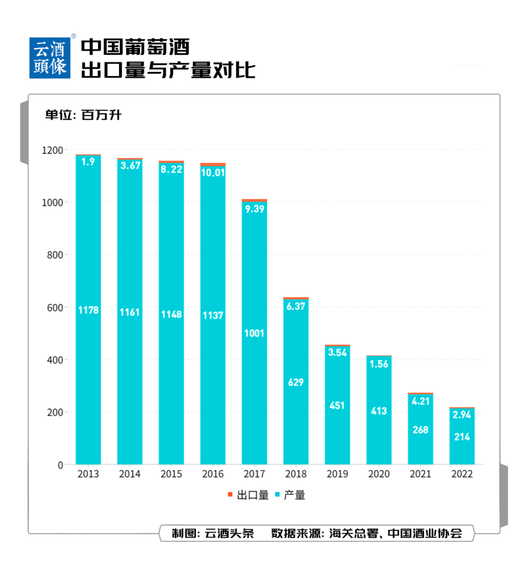 对比2022年进口葡萄酒376.8百万升、156千万美元的量、额来看,葡萄酒出口量级不足进口葡萄酒的1%,金额不足3%,存在明显的差异。